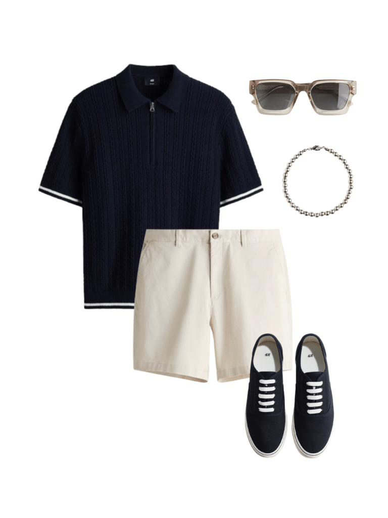A clean, modern look built on contrast—this outfit pairs a textured navy knit polo with crisp beige shorts for an effortlessly polished summer aesthetic.