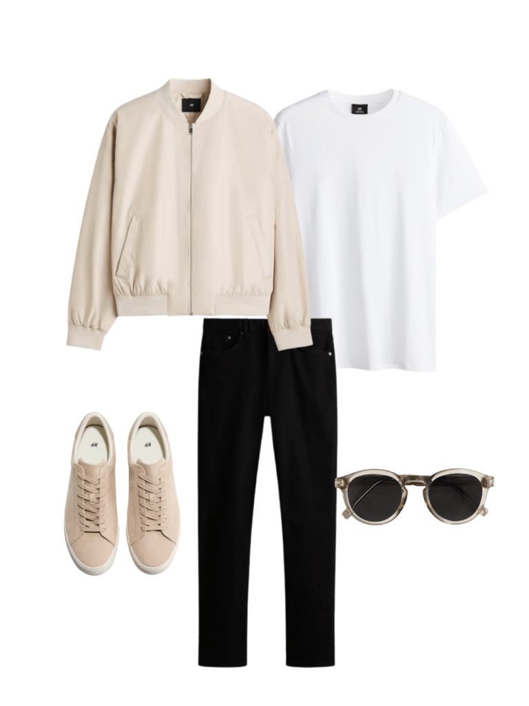 When styling a bomber jacket, I like to keep the rest of the outfit clean and understated. This allows the jacket to stand out as the focal point. A pair of black jeans and a basic white or black T-shirt works perfectly. The result is a balanced look that feels both relaxed and stylish without trying too hard.