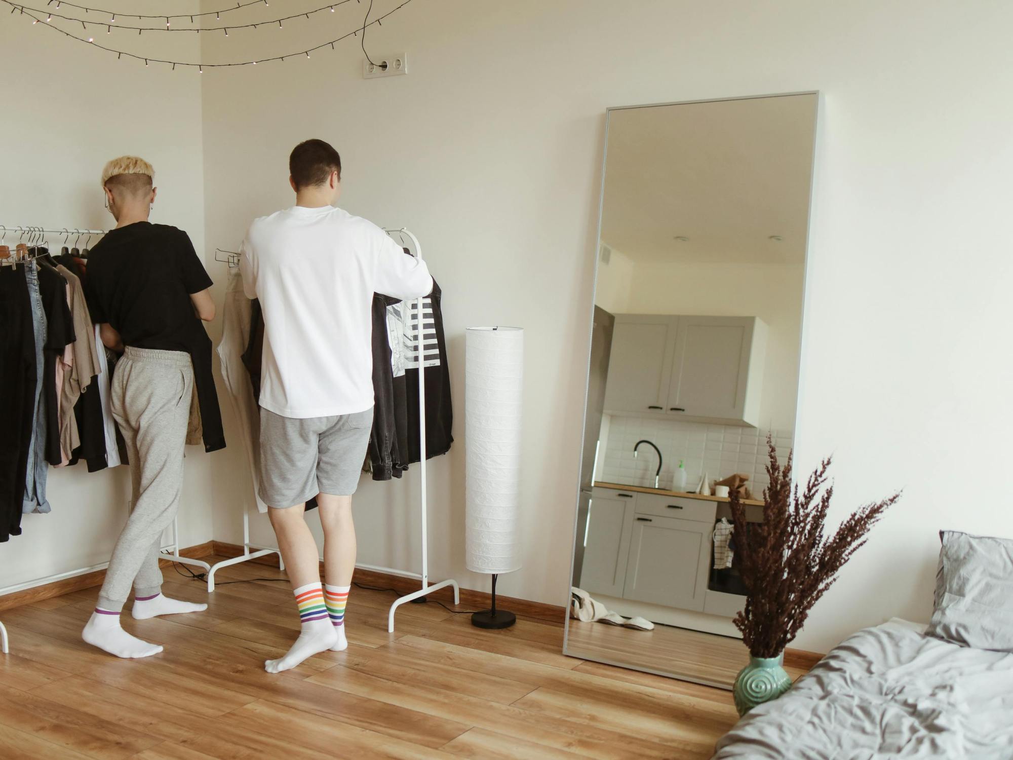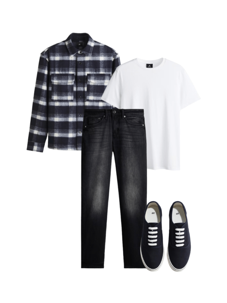 A plaid overshirt over a white tee with dark jeans creates a clean, laid-back look, finished with simple navy sneakers.