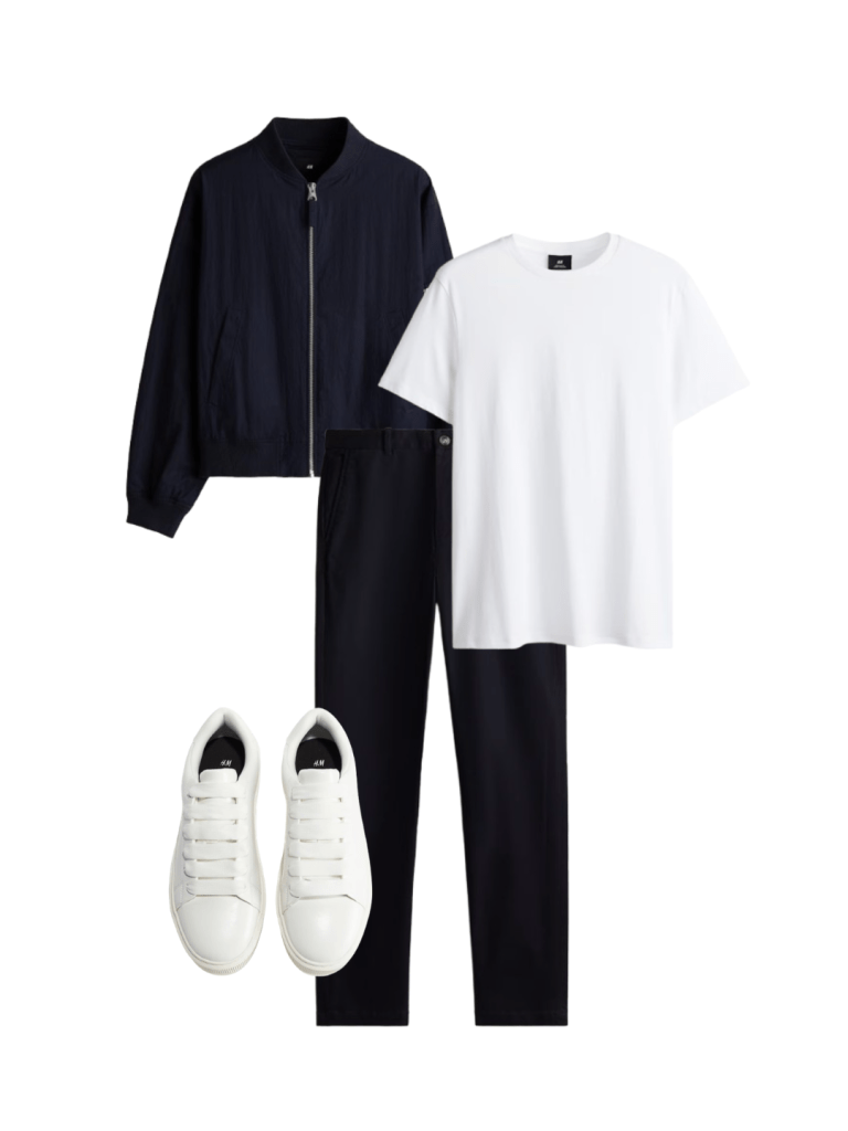 A clean and versatile outfit built around navy essentials. The bomber jacket and trousers create a sleek, cohesive look, while a white t-shirt and sneakers add freshness—perfect for everyday style with minimal effort.