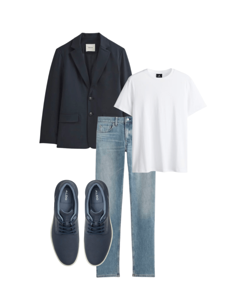 A clean white tee, navy blazer, and light-wash jeans create a relaxed yet polished look, finished with matching blue sneakers.